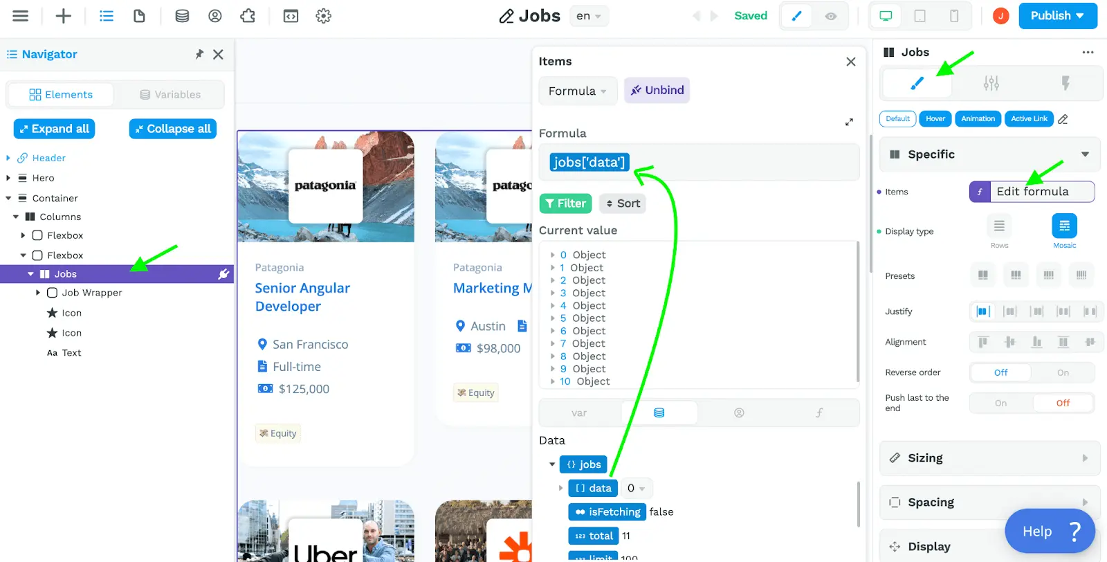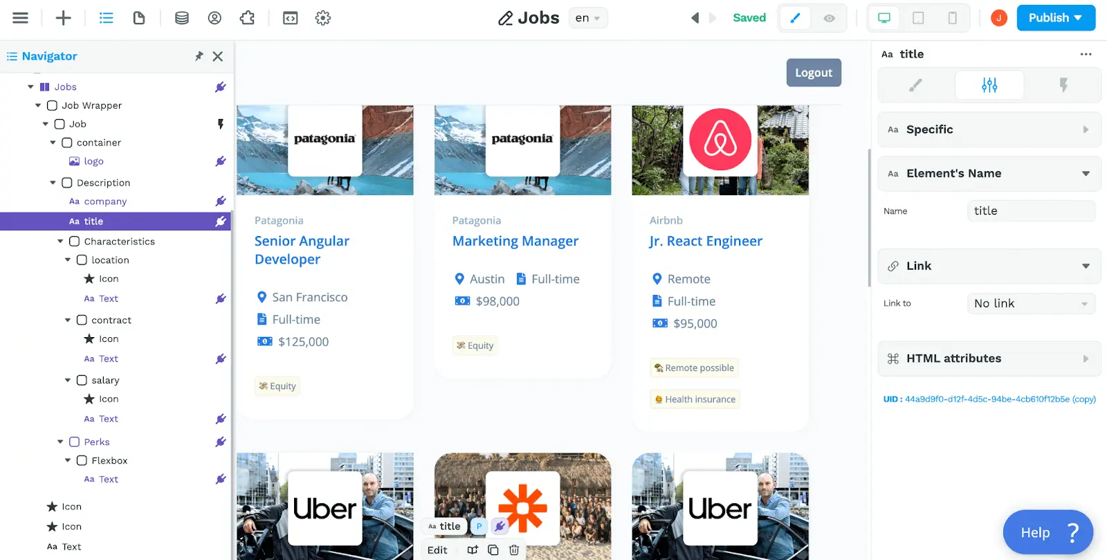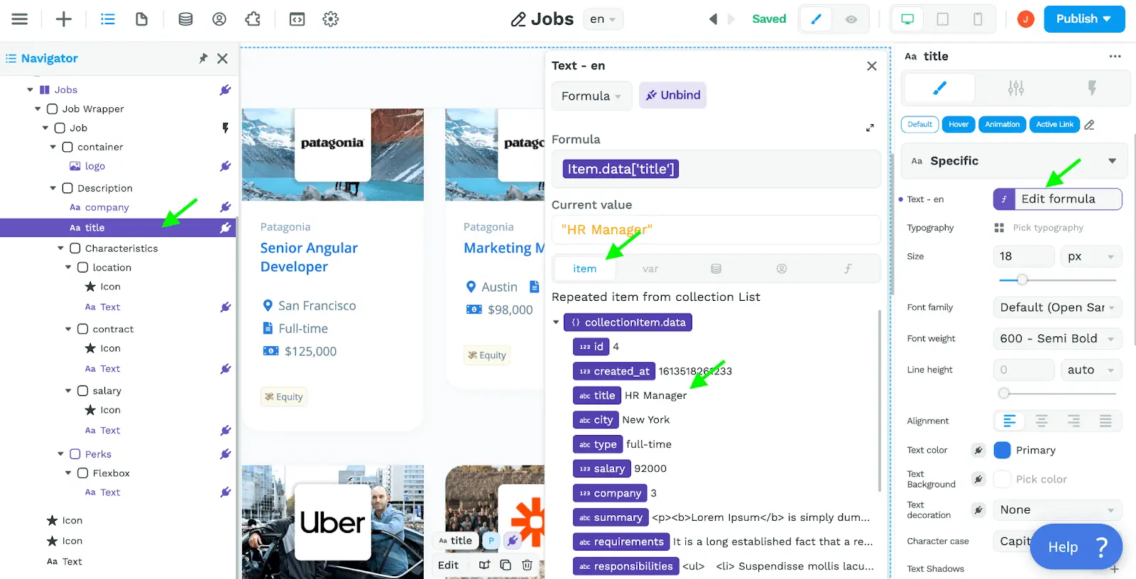 Inside that “Job Wrapper” element, there are other elements that we can bind to specific data fields in our list of jobs: