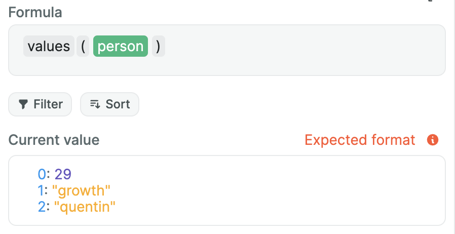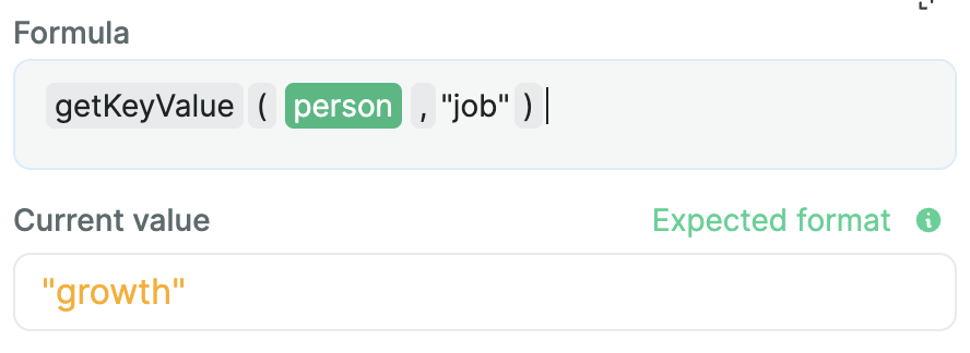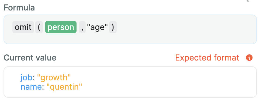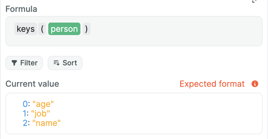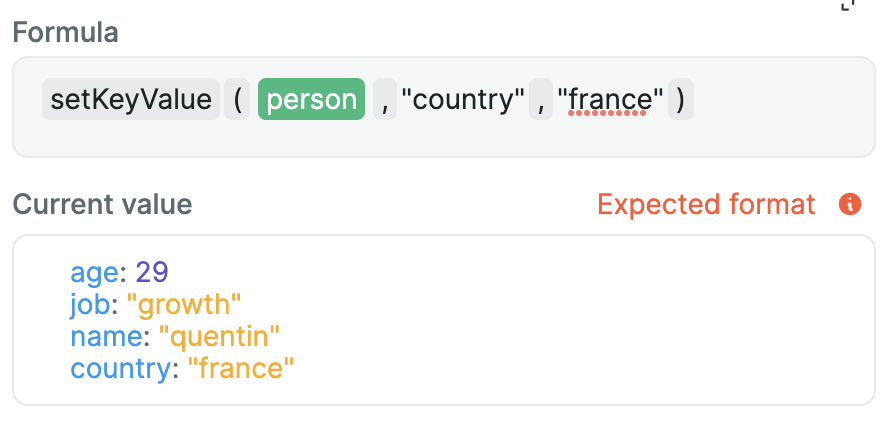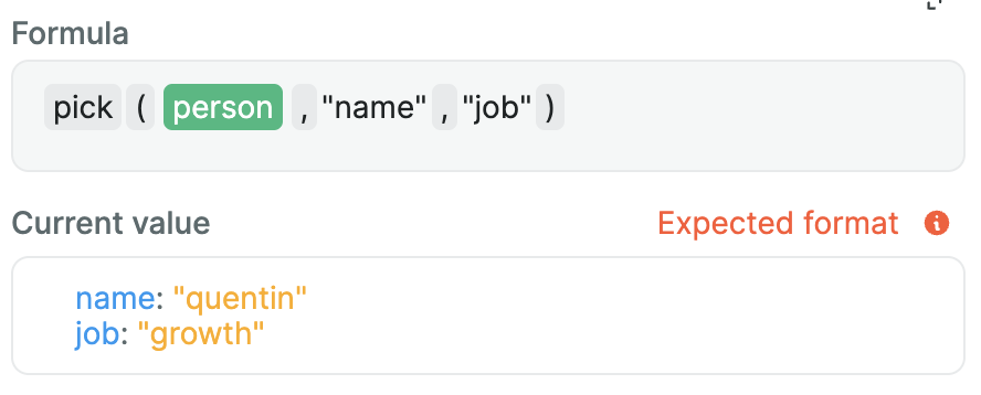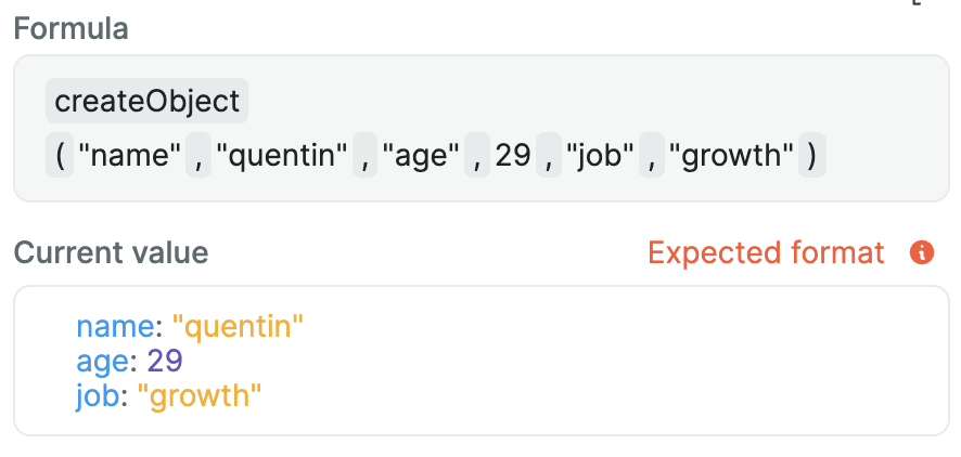 This formula helps you create JavaScript objects using nocode. List pairs of keys and values that will be transformed into an object.